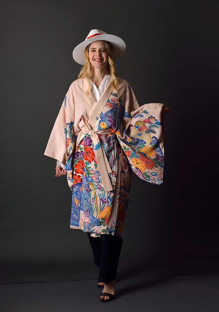 こちらの商品に使用しているヴィンテージ着物は、お仕立て前に専門の業者によりクリーニング済みです。 また、長年大切に保管されていたたくさんの着物の中から厳選した着物で、状態は良いですが経年による色褪せやシミ、キズ、古着特有の匂いなどがある場合がございます。 また、デリケートな素材のため、ご使用方法や環境等により快適にご使用いただける期間は異なりますので、素材の特性をご理解の上ご着用ください。 色落ち、縮み、型崩れの可能性がございます。 クリーニング店でのドライクリーニングをお勧めいたします。 その際、素材が絹の着物であることをお伝えください。