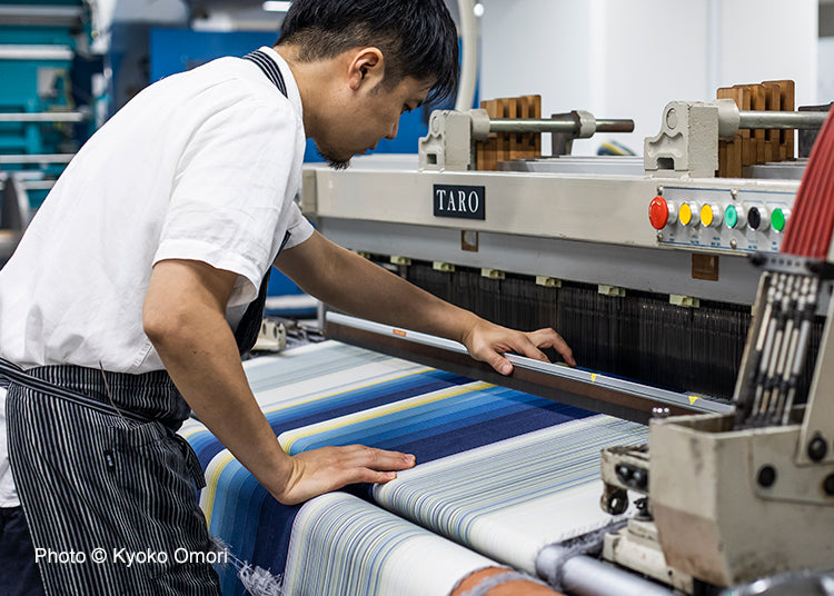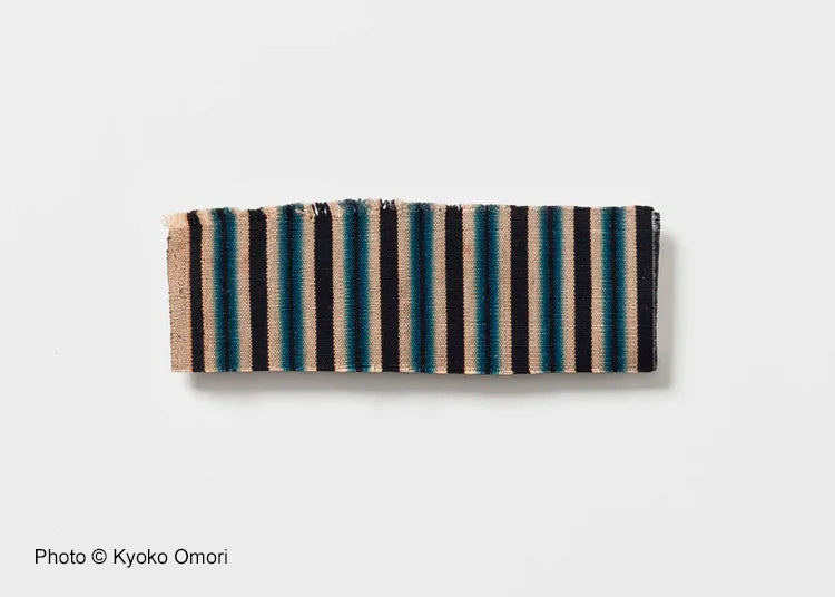 The revival of the once extinct Ogura Ori was spearheaded by Noriko Tsukishiro, a dyeing and weaving artist from Kitakyushu City. Intrigued by the costumes of Noh theater, Tsukishiro embarked on a career in dyeing. In 1983, she stumbled upon a small piece of Ogura Ori in a local antique shop. The fabric was sophisticated and boldly striped vertically. It was thick yet supple to the touch, and despite being cotton, it had a luster akin to silk. Captivated by this ancient cloth, which had been a child’s hakama during the Edo period, Tsukishiro began her research into its revival. She discovered that the warp threads were thinner yet about twice as dense as the weft threads, which explained the fabric's strikingly beautiful vertical stripes—a characteristic not found in other cotton fabrics. However, weaving with the historical thread ratio resulted in a stiff and rough texture. Tsukishiro’s ideal was a fabric that, like well-worn material, had a texture and glossy appearance that blended seamlessly with the skin. After numerous experiments, by 1984, she finally perfected the foundation of the modern Ogura Ori by using approximately three times more warp threads than weft threads.